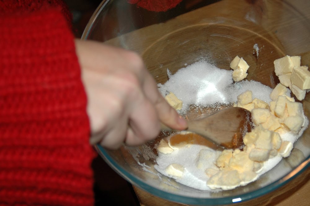 In a large mixing bowl, mix together the margarine and sugar using a wooden spoon until it is light and fluffy. (You could cheat and use an electric whisk!)