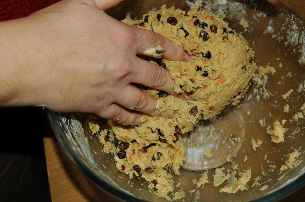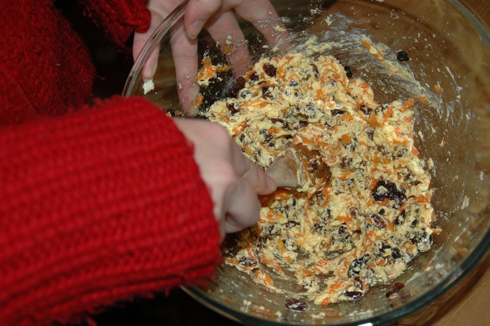 Beat the carrot and syrup mixture into the sugar and margarine. Then stir in the vanilla and almond essences, and the dried fruit.