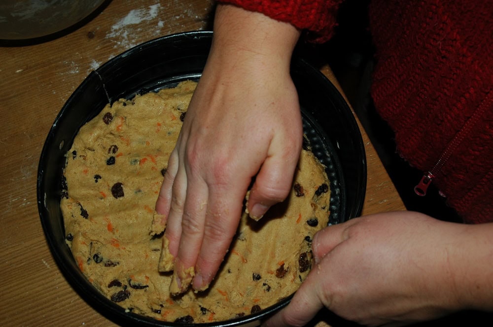 Grease a round cake tin and press the mixture into it. Tip: We used a 20cm diameter (8 inch) cake tin. If you use a smaller one, the cake will need longer to cook.