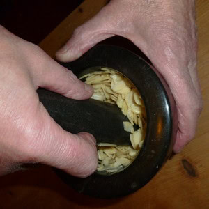 Grind up the almonds with the pestle and mortar - this is how the Tudors would have done it! You can add a little rosewater to make it easier.
