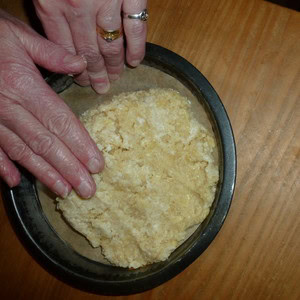 Grease your cake tin with a little butter then line with greaseproof paper. Press your mixture into the tin.