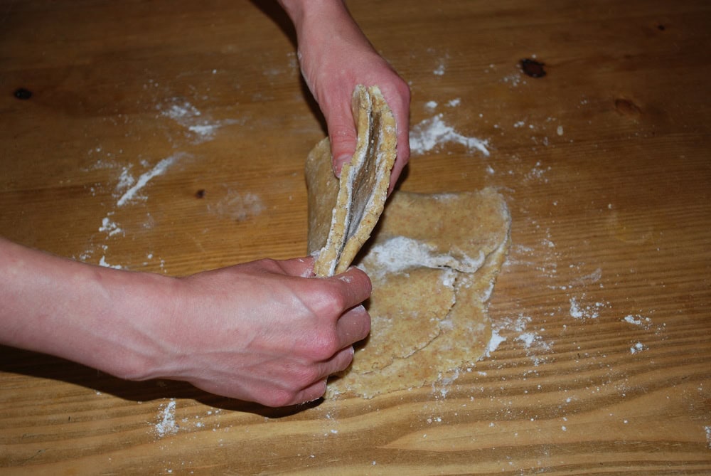 Fold it over on itself four times. Roll out the dough again and repeat the folding over.