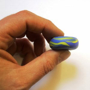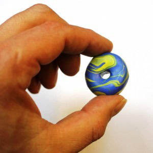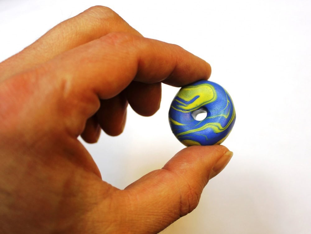 Ask an adult to carefully make a hole through the bead (using something pointy like a knitting needle). It helps to make a hole on one side, then a hole on the other side so that both holes join. You can wiggle the knitting needle to make the hole slightly rounder and bigger.