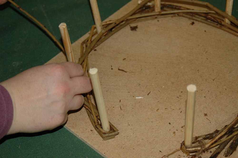 Weave the willow or hazel lengths (or basket weaving canes) in and out of the uprights to build your wall, leaving one section between two uprights as a doorway. Leave about 3cm at the top of the uprights sticking out; this is where the roof will join on.