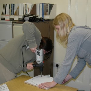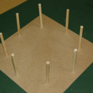 Ask an adult to drill eight holes through your base where you have marked the dots. The holes must be big enough for your 10mm dowel lengths to fit in tightly.