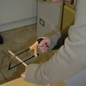 Ask an adult to help you cut your dowel into the correct lengths for both the roof and uprights, using a hacksaw. The uprights need to be 12cm long, and the roof pieces need to be 25cm long.