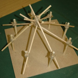 Add the roof by tying the 25cm long, 8mm diameter dowel roof beams to the upright poles using twine. Tie the beams together where they meet in the centre. (For this example picture, we added the roof beams before building the walls.)