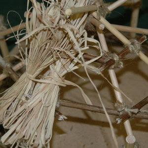 Tie the raffia into small bundles and then, working from the bottom up, tie these bundles onto the beams and struts to thatch your roof.