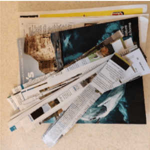 Tear your newspaper or magazine pages into thin strips (3cm wide is a good size). You will need quite a few!