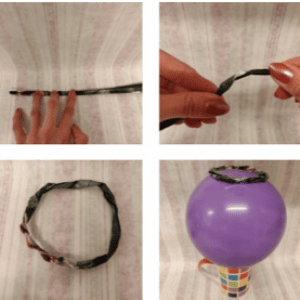 Take one strip of newspaper, fold it in half lengthways a couple of times to make it thicker and then twist it into a ring shape roughly 8cm across. Use sellotape to fasten the ends together and then fix the ring onto the top of the balloon with some more sellotape. This will form the base of your finished pot.