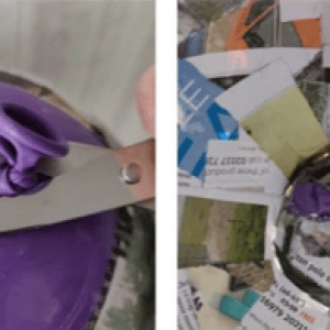 Once dry, it is time to remove the balloon. Lift it carefully out of the cup – you might need some help as it may have become stuck to the cup. Turn your pot over and stand it on its base. Carefully snip the knot off the balloon and as it deflates, it should come away from your papier-mache pot.