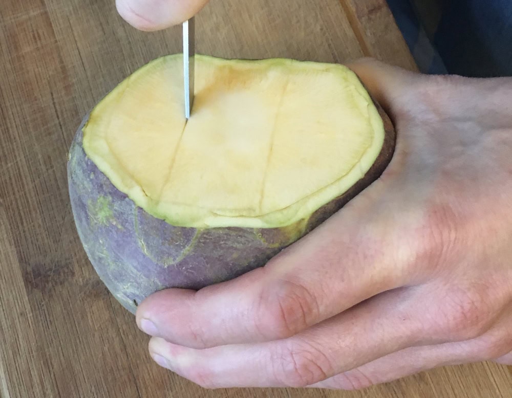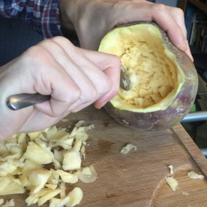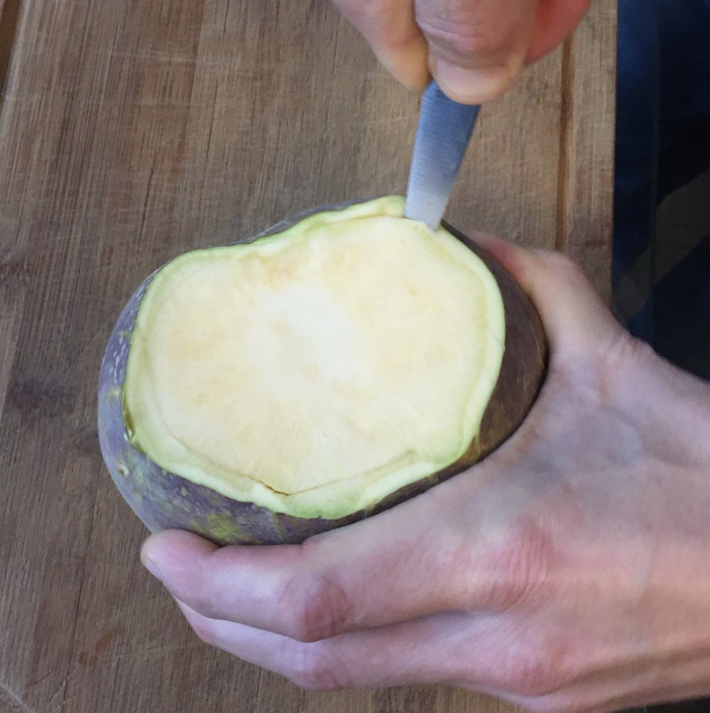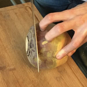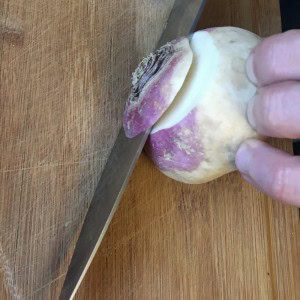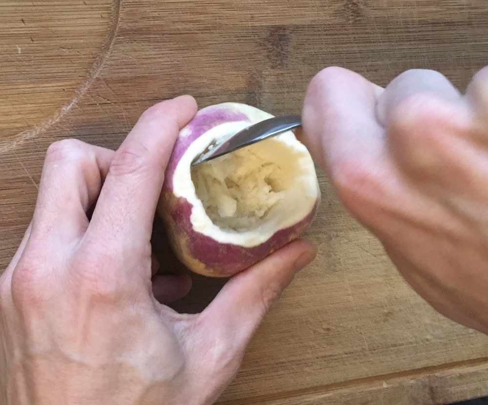 Use a knife to score around the inside edge leaving about a 0.5cm border and loosen the inside of the turnip.