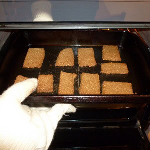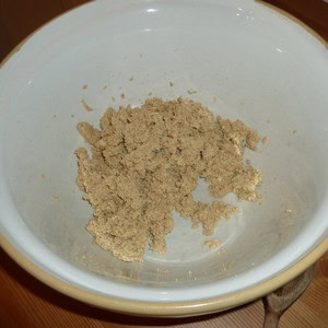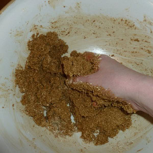 Pour the syrupy mixture onto the oatmeal and margarine and use your hands to bring it together into a firm paste. (This is the point where we had to add extra oatbran because our mixture was too sloppy to hold together.)