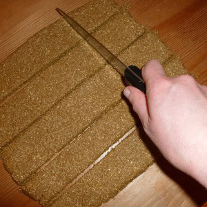 Roll out your mixture to approximately half a centimetre thick and cut it into biscuits using a knife. Transfer the biscuits onto a baking tray.
