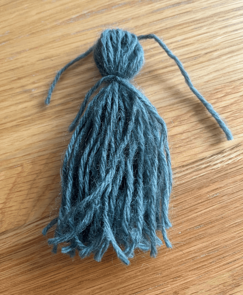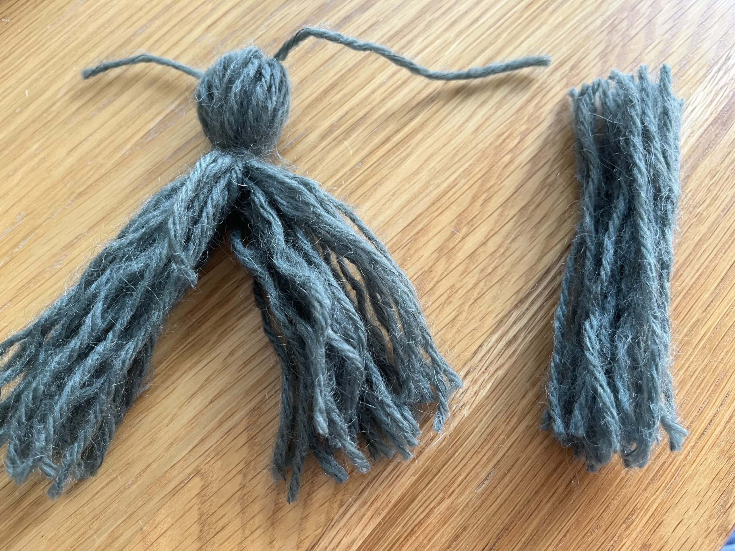 Complete the arms by cutting two small pieces of yarn (either the same colour or a different colour) and tying one to the end of each arm. This will secure the threads and create wrists.