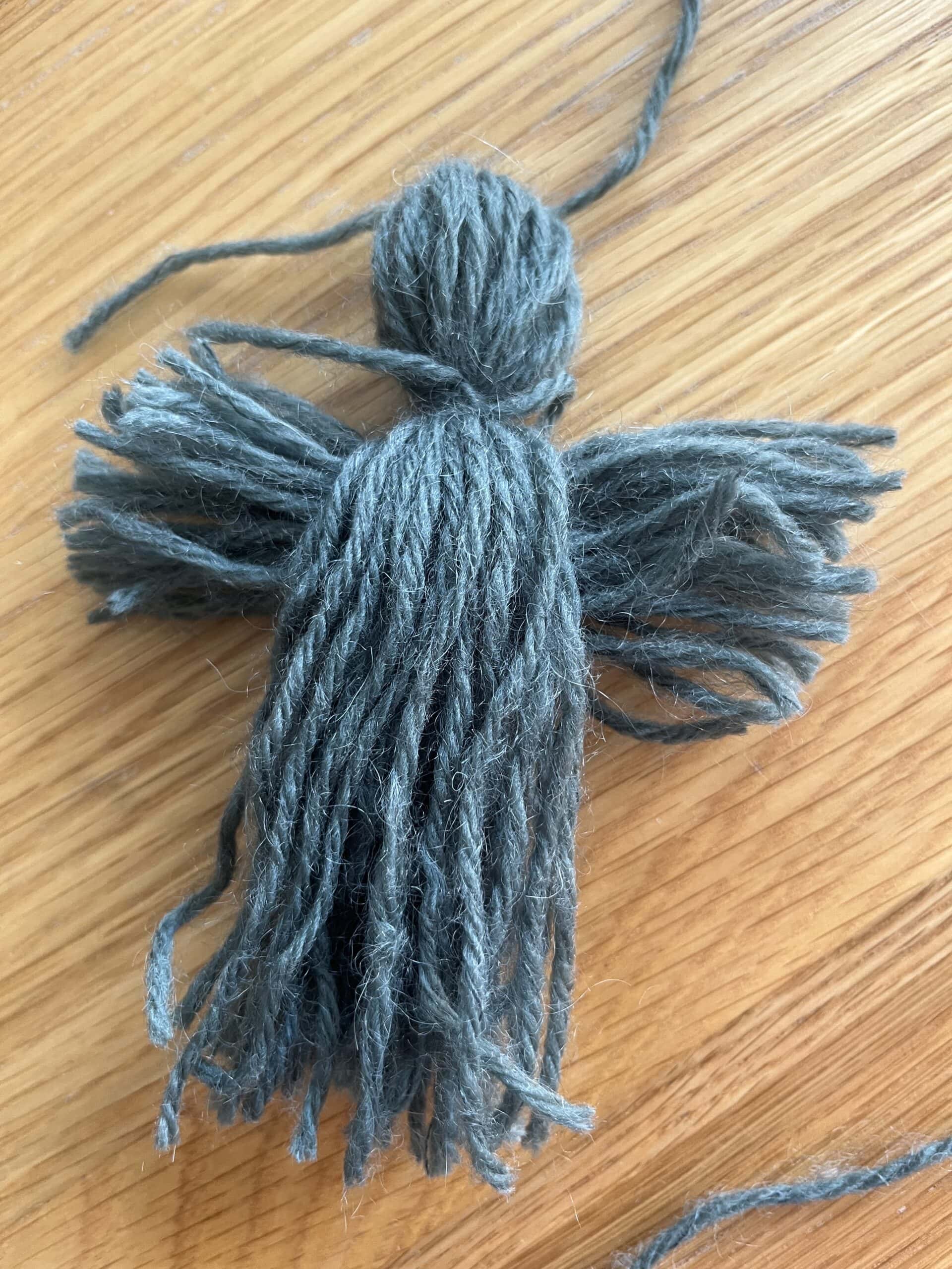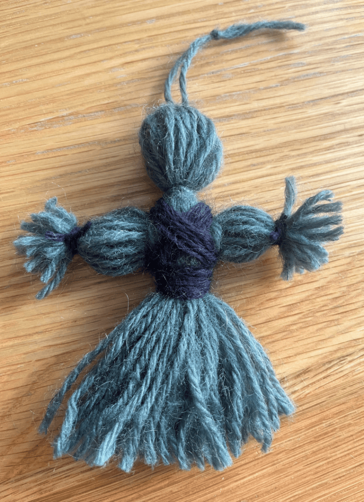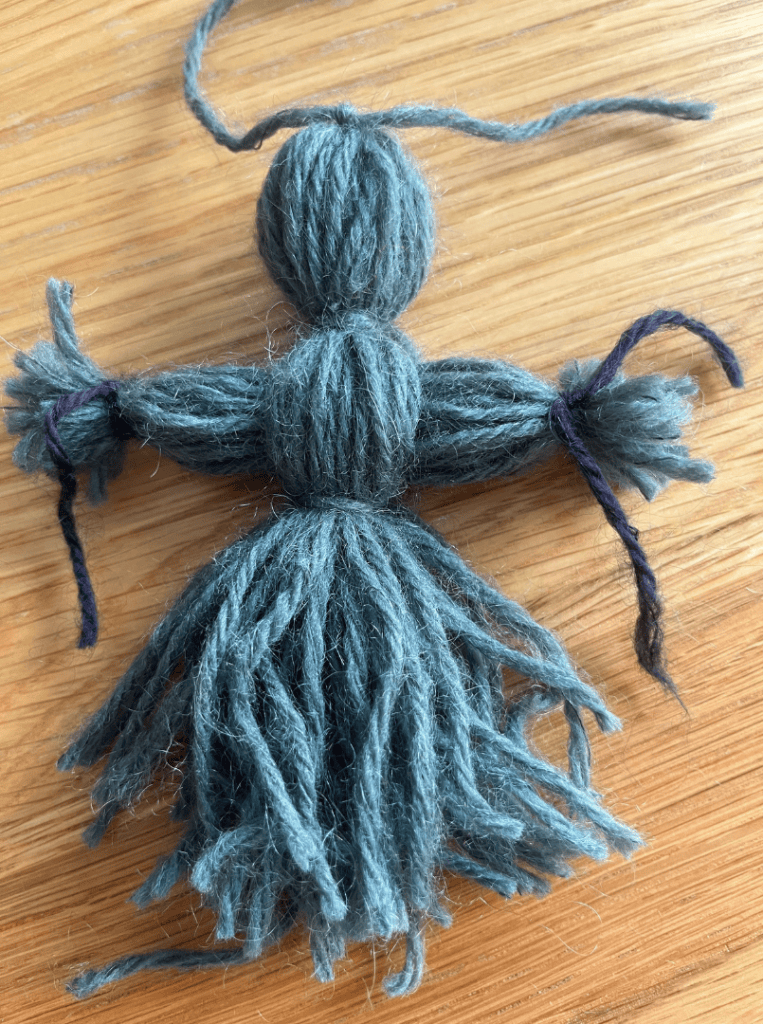 Your doll is nearly finished! The final step is to use scissors to even-up the doll’s skirt and arms by carefully trimming the yarn so that it is all the same length. Trim any other pieces of yarn that you used to tie the body and arms.