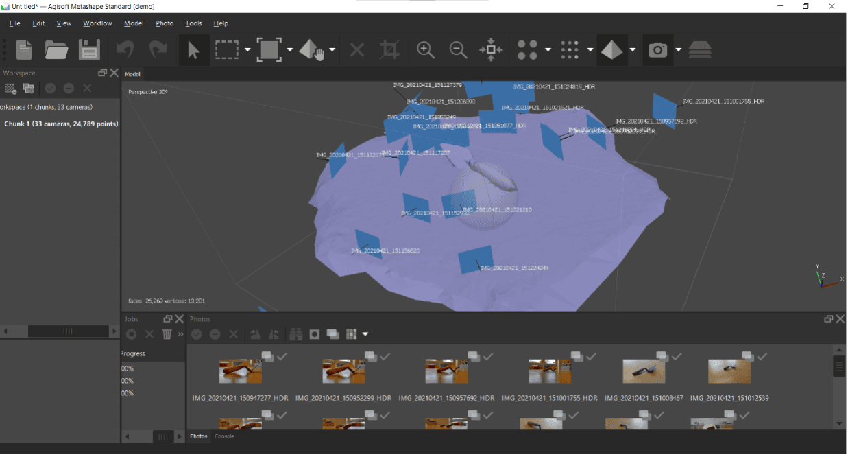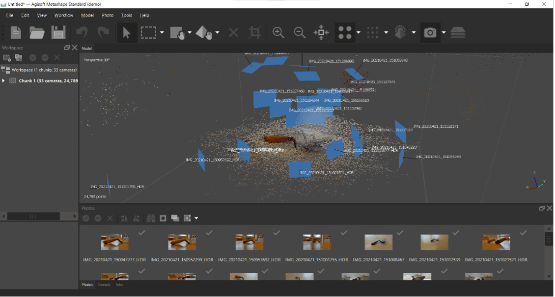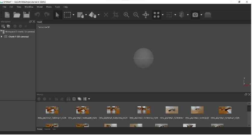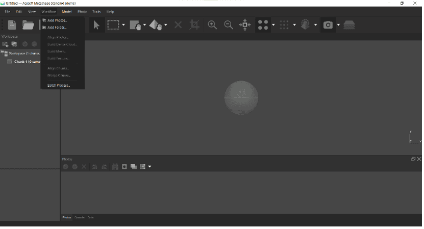 Download your photos onto your computer. Open up Agisoft Metashape. Clicking on the grey sphere in the centre will allow you to rotate your view of the model. You can also scroll the middle mouse wheel to zoom in/out and hold the middle mouse button to pan.