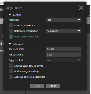 Now we can start to build the model. Firstly, go back to “Workflow” and click “Align Photos”. These settings should work fine for your first project.