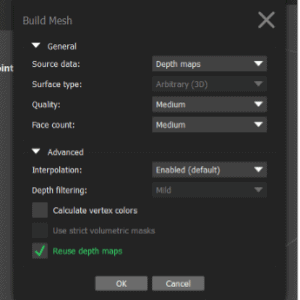 Now we need to start connecting all these little dots together. Go back to “Workflow” and click “Build Dense Cloud” and use the following settings.