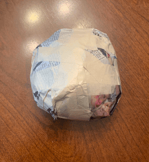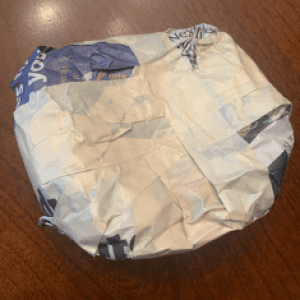 Keep adding layers till it’s about the size of a hand. Wrap it in masking tape so it becomes a smooth surface. Make sure an adult’s around if scissors are being used to cut the tape!