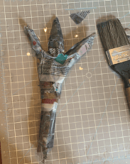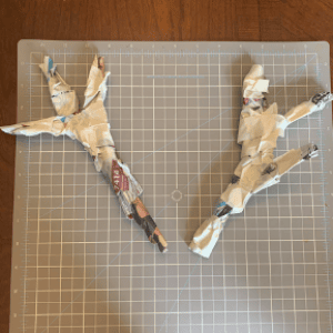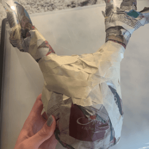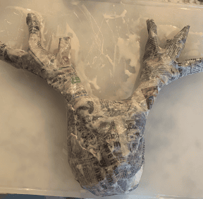 Now we can papier mâché the antlers. Like the head, rip off strips of newspaper and soak, then apply. Cover all the antlers. Set aside to dry alongside the head. This could take a few hours.