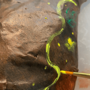 Once the brown layer is dry, I chose to decorate one side with painted flowers and swirls of different colours to represent the environmental part of this year’s Festival Of Archaeology theme (climate and environment)!