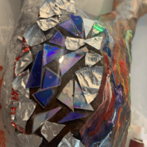Then, with an adult present, cut up the old CD into triangle shapes. Then either cut up the milk bottle tops or leave them as is. Glue the CD shapes and the milk bottle tops, shiny side up, on the other side of the antler head.