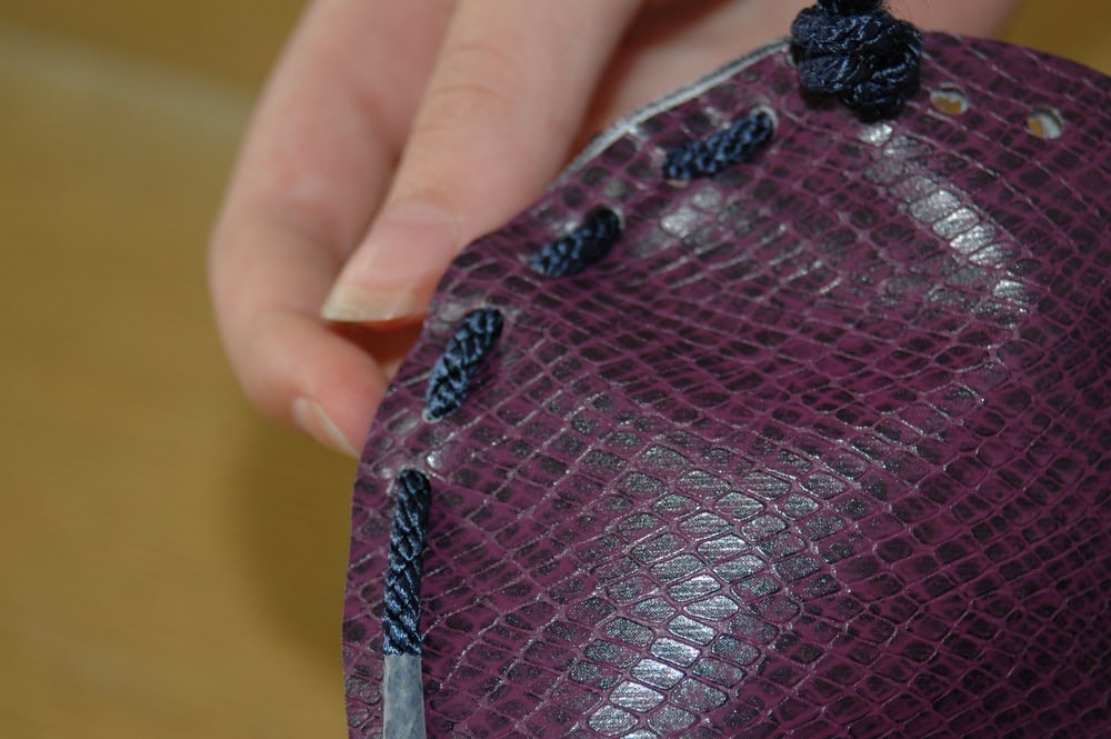 Now you need to thread up the sides of your purse. Thread one cord in and out of the holes up one side of the purse starting from the middle hole.