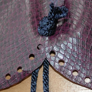 Lay your two purse pieces flat (leather sides facing up) with the curved edges overlapping. The middle holes on the curved edge need to line up. Pass two pieces of cord through the middle holes and tie a knot to secure it on the outside. Your two pieces should now be joined with the knot on the outside, like in the picture.