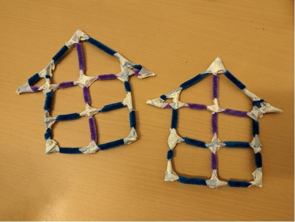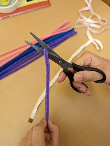 Prepare four 15 cm long and twelve 10 cm long chenille stems (pipe cleaners) for the front and back scaffolds of the paper house. Please be careful when using scissors and bend the ends of the stems over to avoid exposed sharp edges.