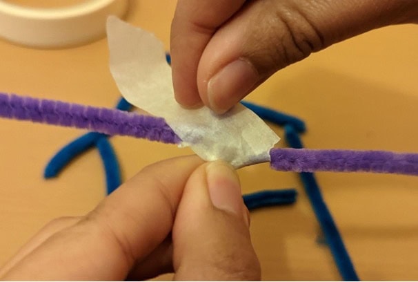 Prepare at least nine chenille stems and masking tape to connect the front and back scaffolds, as shown in the diagram below. You could strengthen your scaffold by adding more chenille stems.