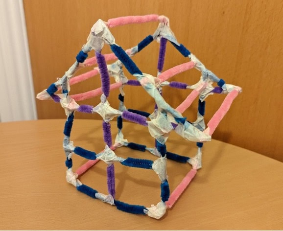 Tie all intersections in a cross pattern with masking tape. Too easy to tie the intersections with masking tape? Challenge yourselves by replacing masking tape with the more traditional materials of paper strips and glue.