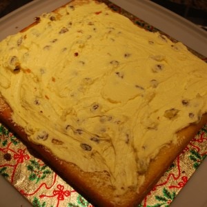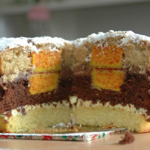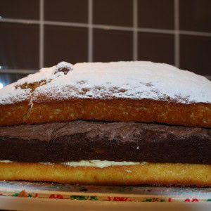 Keep going adding a layer of cake and then a layer of something sticky until you have used all three layers of cake.
