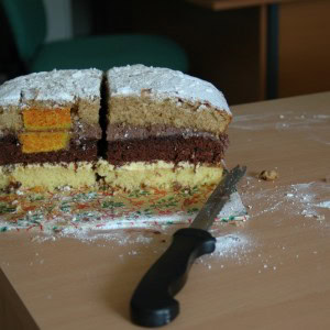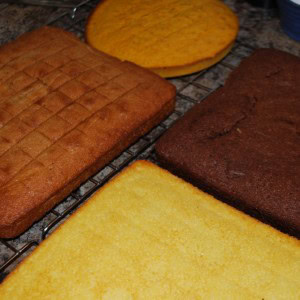Make at least three layers of cake. These need to all be the same size. Each cake needs to be a different colour. For our stratigraphy cake, we made three rectangular cakes: a vanilla sponge (pale yellow), a chocolate sponge (dark brown), and a coffee sponge (mid brown). Alternatively, you could use food colourings to make different coloured cakes, or make different types of cakes, such as fruit cake or chocolate chip songe cake. We also made an extra round cake which we dyed using yellow food colouring – this will be used later to make a ‘pit’!