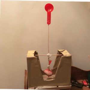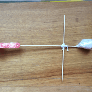 Using sellotape, fasten the scoop to the pointed end of the long skewer. It can help to push the point of the skewer through the base of the scoop, but it is not necessary. Sellotape the pebble firmly to the other end of the skewer. This is the COUNTERWEIGHT which causes the long arm to swing up and launch the missile!