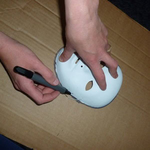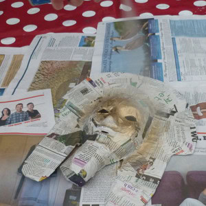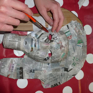 Time to get mucky! Tear strips of newspaper and stick them to your mask using wallpaper paste (or a mixture of flour and water). Make sure that you cover your whole mask. Roll a small ball of newspaper and push it up the end of your beard, and cover this with newspaper strips too. Leave your covered mask to dry overnight.