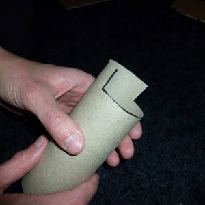 Cut two slits in your cardboard tube about 2cm long on opposite sides of the tube, and then cut between these slits on one side, so that a small section comes off the tube. It should look like the picture – this will be your beard!