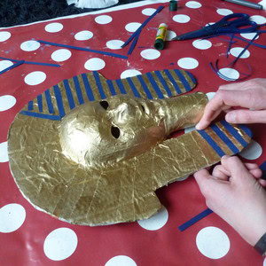 Paint your mask gold. We used gold spray paint; if you use spray paint make sure you do it outside or with lots of windows open as it can get smelly! Leave your painted mask to dry.