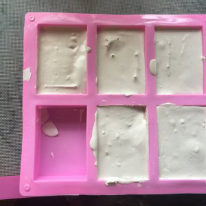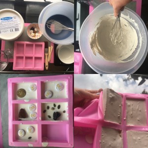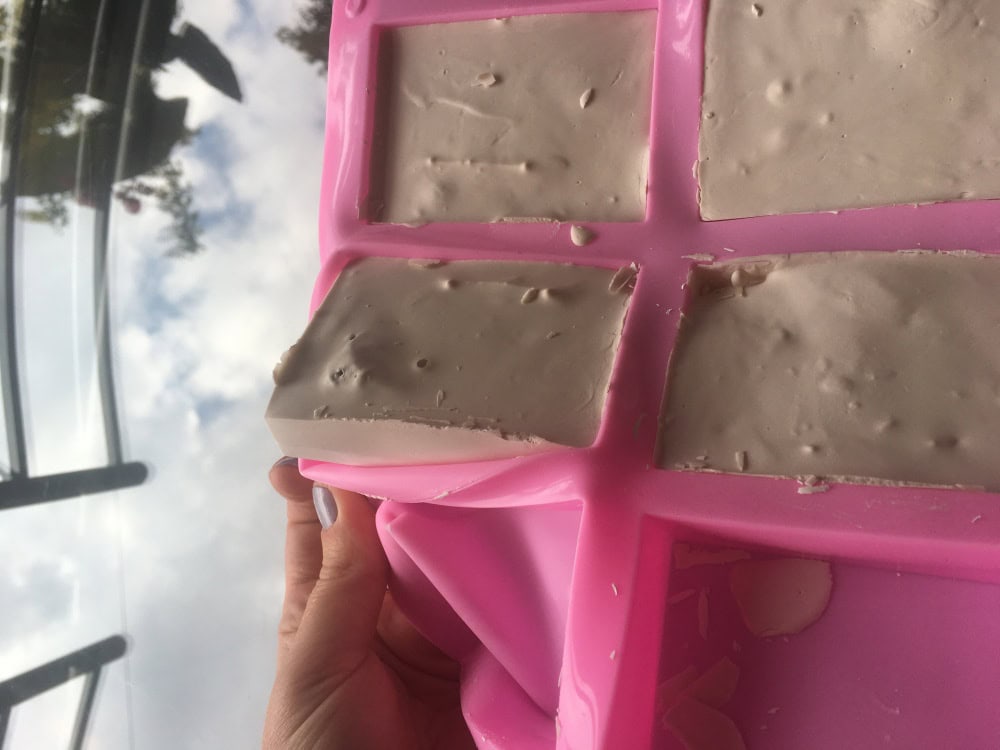 If your mould is something reusable like a bread or muffin tin, line it with cling film so that the block can be removed after it hardens. If the mould is disposable, like a small box or plastic cup, this is not necessary. You can simply cut the disposable mould off the block once it hardens.