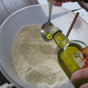 Mix together the flour, salt and oil in a big bowl.
