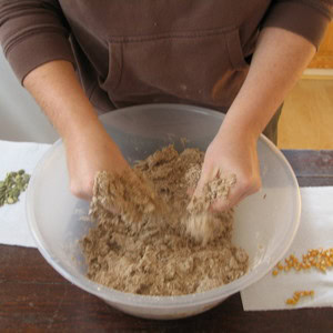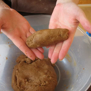 Add the gloopy paste into the floury mixture. You’ll need to get your hands in and squish it together! If the mixture is too dry, you can add more water or you may wish to add some brown ready-mixed paint to make the mixture browner and stickier!