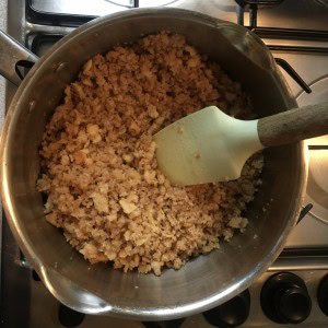Slowly add the breadcrumbs and mix it into a thick, stiff, well-blended mass.
