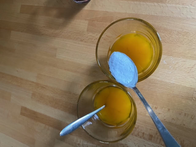 Once the turmeric dye has cooled seperate the mixture out into two glasses. Into one of these glasses, add a teaspoon of baking soda.