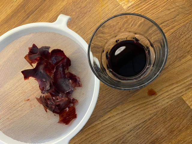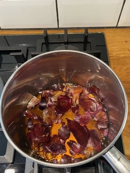 After 10 minutes take the pan off the heat and leave to cool. Once cooled, strain the onion skins out and transfer the liquid into another glass.