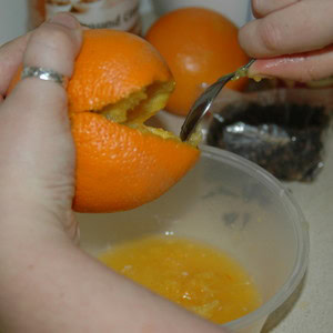Use your teaspoon to scoop out the inside of the orange. Make sure you do this over your bowl - it can get messy!