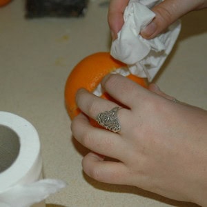 Once you have reomved all of the orange's insides, stuff it with kitchen roll to absorb any juices left over. Keep replacing with new kitchen roll until the inside of your orange is dry (you can now remove the kitchen roll).