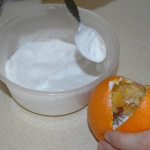 In another bowl, mix together enough salt and bicarbonate of soda to fill your orange, then spoon this mixture into the orange.