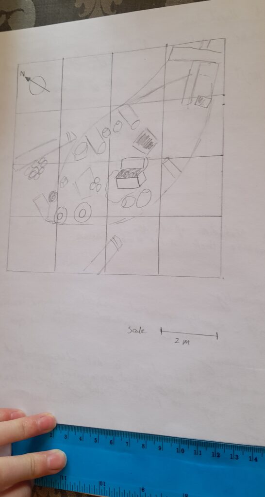 We learnt about some of the different methods of underwater archaeology and some fascinating case studies of shipwrecks, such as the Mary Rose in England, the Antikythera shipwreck from Greece and the Nanhai 1 shipwreck in China. Tilly then showed us how to archaeologists record underwater sites using grid drawings, and we had a go at recording an example of a shipwreck. Here’s a great example from one of our members: