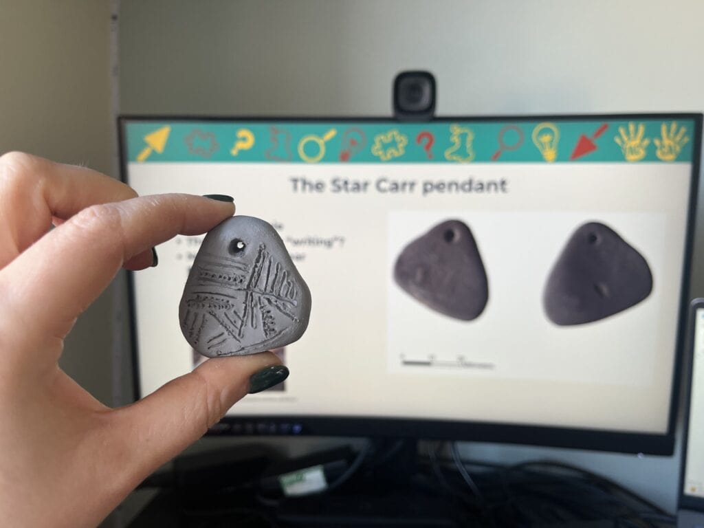 We then focussed on some of the period’s most mysterious objects – carved stone pebbles – and looked at examples from Rhuddlan in Denbighshire to compare to the famous Star Carr pendant. We debated what the markings on these stones could be – an early form of writing? A map or chart? Or something personal to the person who made them? Using clay or saltdough we recreated some of these mysterious carved stone objects and doing so formed new theories of what they could mean!