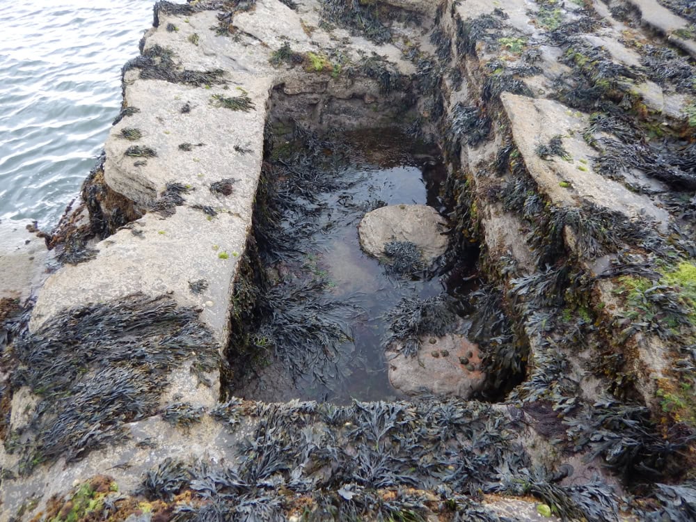 The example at Beadnell was cut into the rocks and has a recess to which a wooden lid can be fixed so that the fish did not escape at high tide. Other examples are at Robin Hoods Bay in Yorkshire and Cresswell in Northumberland. Fish hullies tend to be found in the North-East and Yorkshire and appear to only have been used in areas where no deep water harbour was present.
